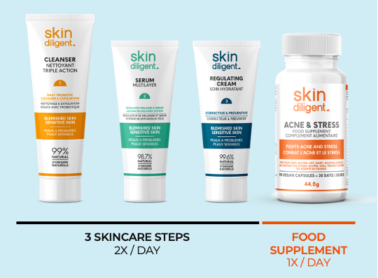 - We started the formulation with one child in mind, that of my teenage daughter. Effectiveness and safety were key pillars in our development. We knew that acne had to be targeted from inside and out. For this reason, Skin Diligent’s Acne-Prone Skin kit contains 1 food supplement and 3 skincare products. The skincare has a simple routine, with numbered steps for ease of use and formulated for 1-month use. Our list of NO ingredients (absent in our formula) is very long, formulated to be clean and natural.
